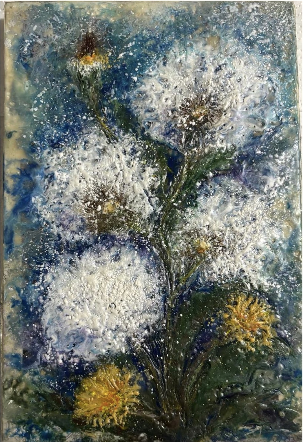 Моя работа с одуванчиками в этой технике заняла второе место на российской неделе искусств.