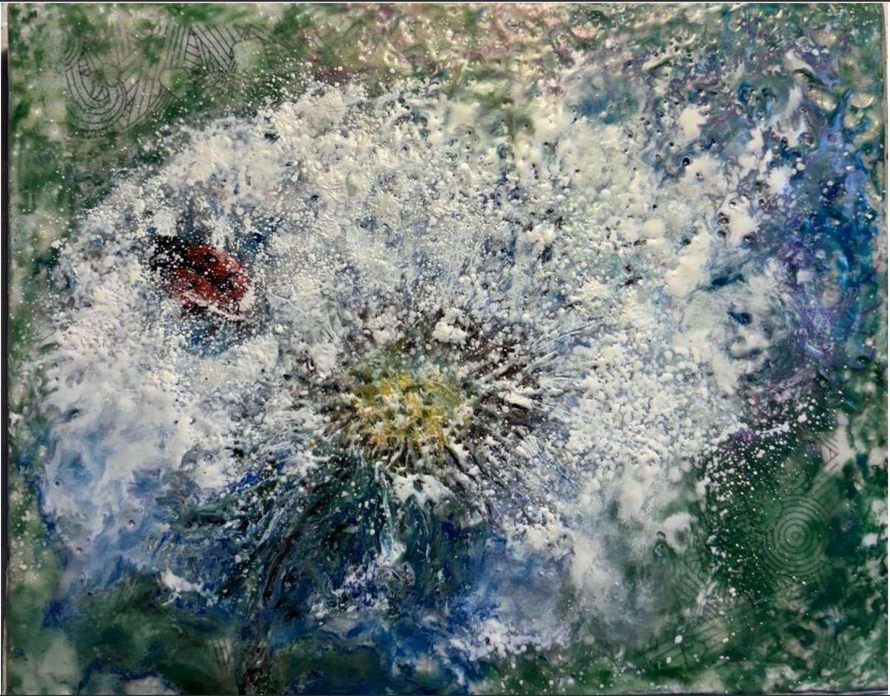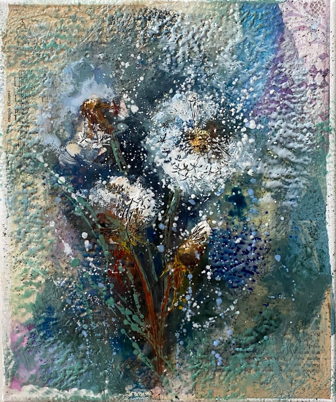 Поверхность холста покрыта мягким рельефом, восковые слои будто светятся изнутри. Тонкие стебли и пушистые головки едва угадываются сквозь прозрачные слои воска, будто растворяются в утренней дымке. Эта картина - ощущение тёплого летнего воздуха, света и тишины, запечатлённое в воске