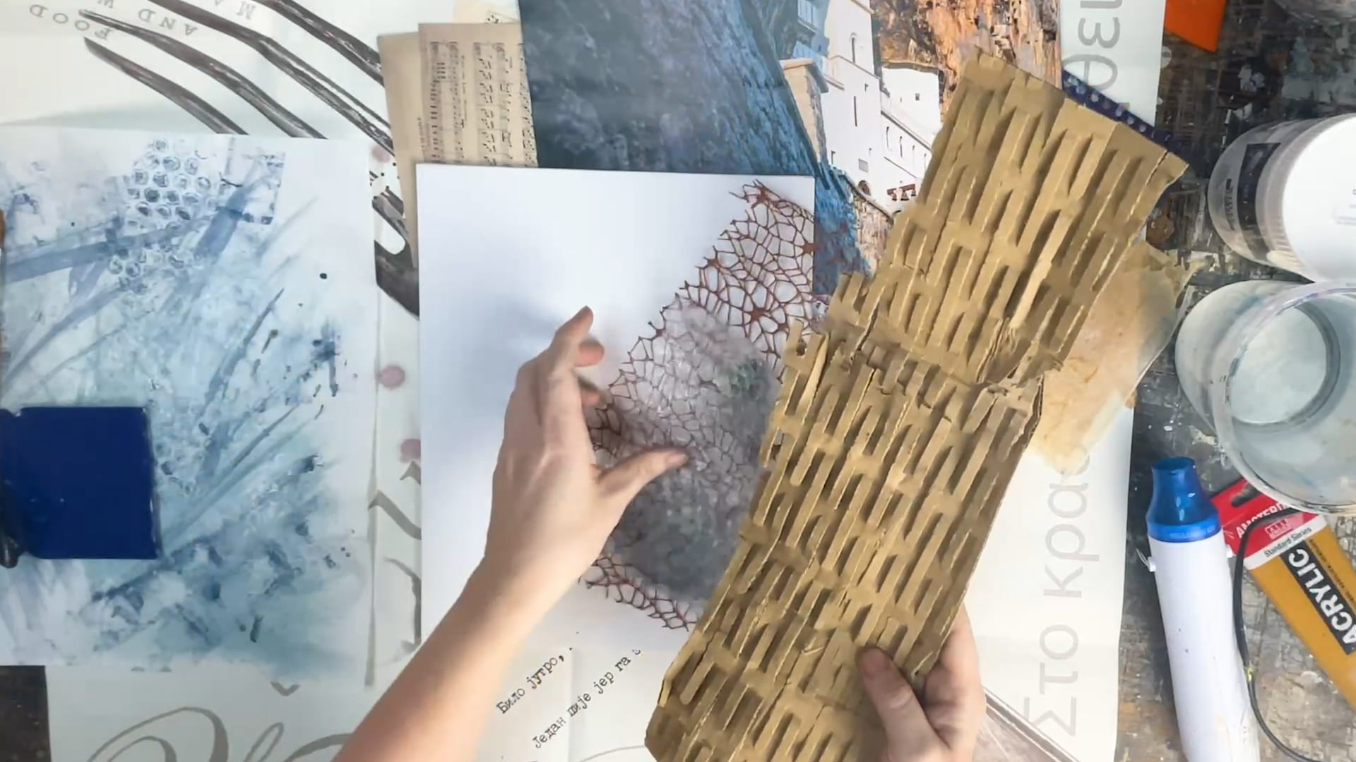 Флористическая сетка, обычный гофрокартон и песок для создания невероятных фактур.